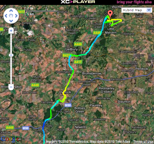 You can just glimpse the River Wye in the distance, but beyond that it was anyone’s guess! I had another good climb over Coleford but at this point I had no idea that I was further south than Pandy and Abergavenney – the Black Mountains wew invisible! I had a couple more smaller climbs but I ended up in a large “blue” hole (or should I say grey hole) with no clouds and I eventually ran out of steam and and landed at about 1625 near the village of Llangwm about 4km from Usk. Straight line it was 54km, but with the 2km out in front of the hill, and all the wiggles it came to 60.8km overall which is my furthest flight for a few years…! Click here to view the flight in the new XC Player.