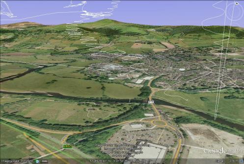 By the time I’d walked back up and untangled my lines a couple of people had glided out and found lift of the town, however this was definitely a death or glory strategy. And it was very much looking like death for Jerry and me on our identical Sigma 8s after we found ourselves heading inexorably for Castle Meadows without so much as a blip from our varios. But the gods must have been smiling on us because Jerry (who was a few hundred meters in front of me) started circling when we were less than 300′ above the landing field! I quickly joined him and together we slowly climbed out in a gentle NW’ly drift. Jerry was definitely climbing better than me (I put that entirely down to him having an Impress 3 rather than me having poorer thermalling skills ๐ ), and after five minutes he was maybe three or four hundred feet above me. But I persevered and actually headed in a more N’ly direction than him which took me over the hospital and the NW edge of town, compared to his route which followed the river.