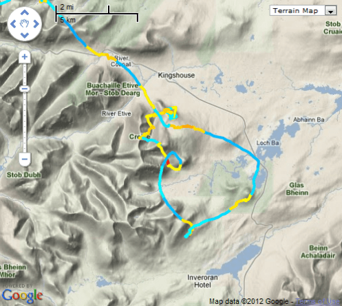 It was now 1315 and after an hour and a half in the air I was feeling a bit more comfortable about being in the mountains, and in a surprisingly bold and decisive move (for me) I thought I might as well try to get onto Aonach Mor and maybe complete a big triangle if I could get back to takeoff again. But how to get there? I decided to head NW in front of the Buachaille across the Glencoe valley towards Garbh Bheinn.