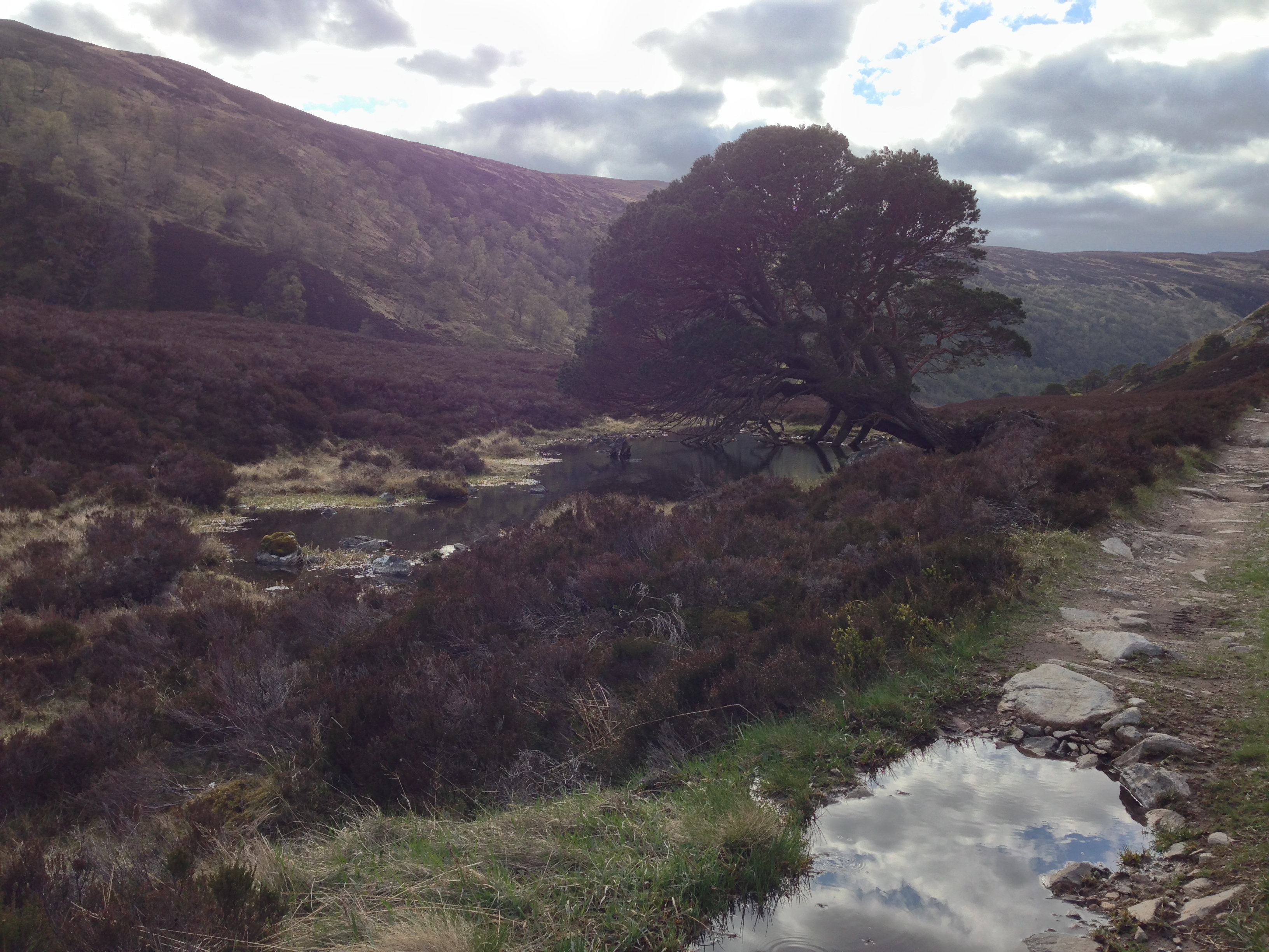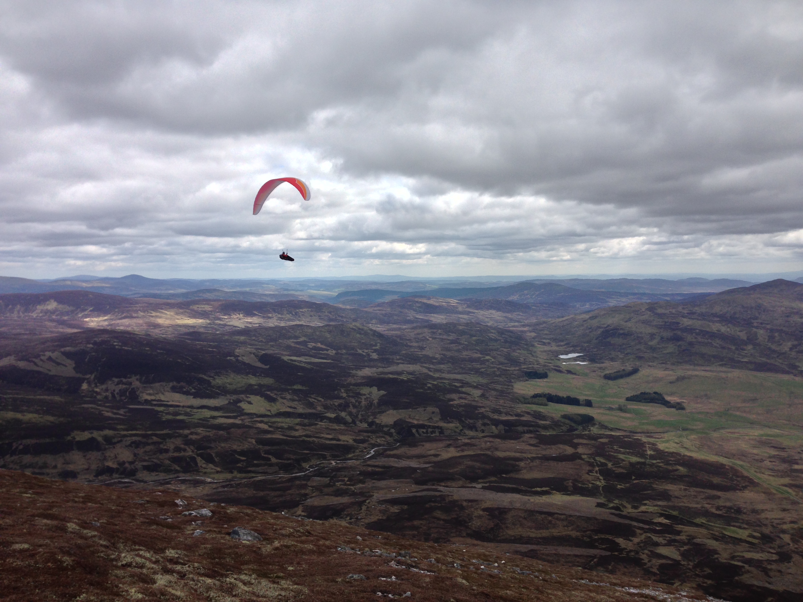 I took off at just after 1400 and was immediately torn between following the crowd on their way to the first TP about 20km due north of takeoff, and heading off on a bearing of 030 to my TP. Stupidly I ended up hedging my bets and heading more or less up the middle before deciding rather too late to follow the herd. So I ended up after about an hour nice and high (almost 5,000ft) but with a big valley to cross before I’d get onto the sunny southern slopes of the main Cairngorm range.
