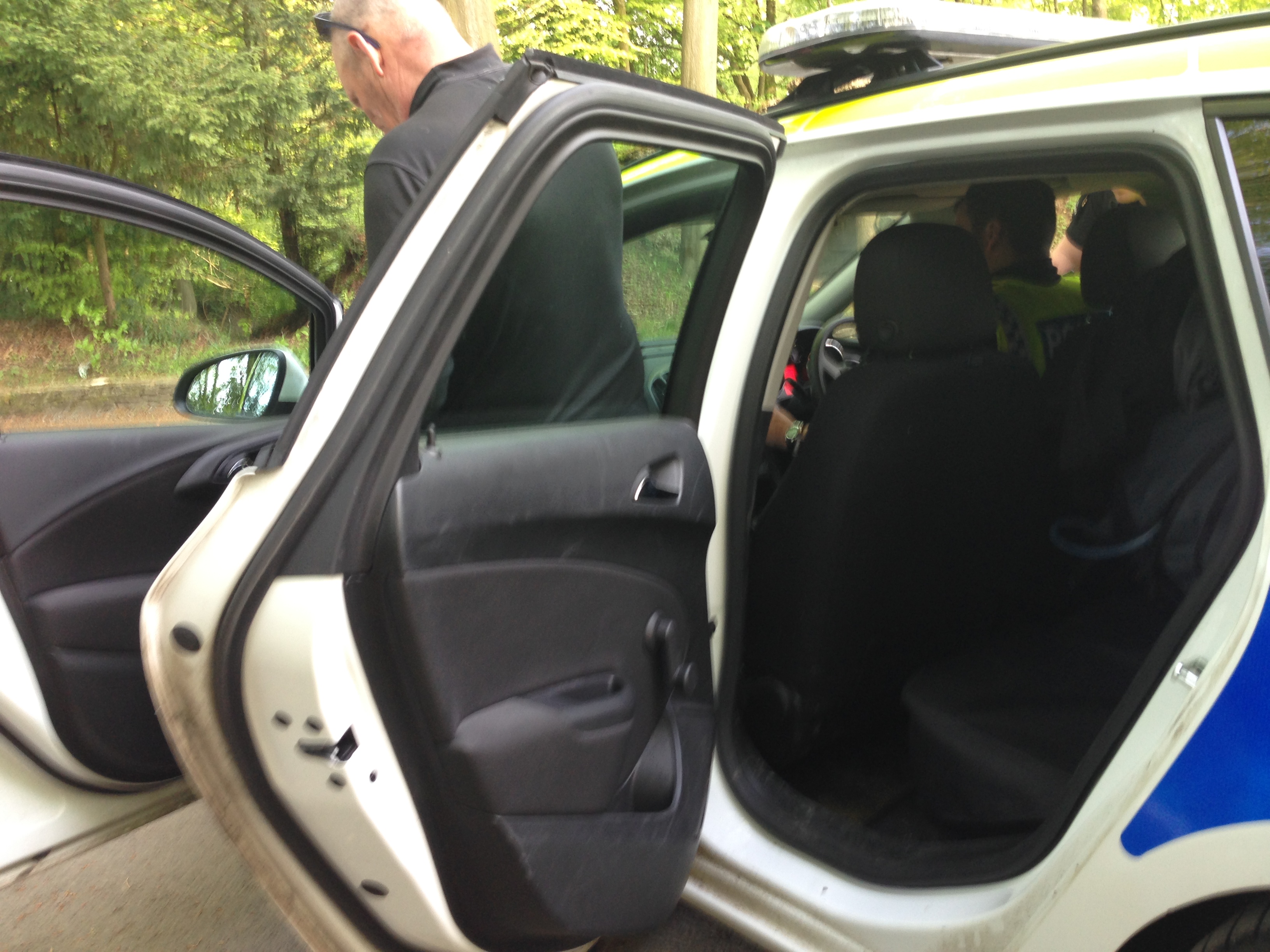Now you might think that’s the end of the story, but far from it – as we were just about finishing up packing up a couple of policemen appeared through the hedgerow. Uh oh, had we done anything wrong? No, but they had received a report from a member of public that they had seen a paraglider/motor in difficulties, and asked whether it was either of us. We agreed it was probably me that they had seen, but no, I was absolutely fine. After taking our details we got onto the subject of how we were going to get home. We said we’d get a bus to Cheltenham, and then a train back to Bristol, then Bath. They said we’d be lucky, and offered us a lift to Cirencester, which we gratefully accepted. Result! I can’t really say much more about the journey except for two things – it was the first time I’ve ever been in a police car, and it was the fastest I’ve ever been in a car!