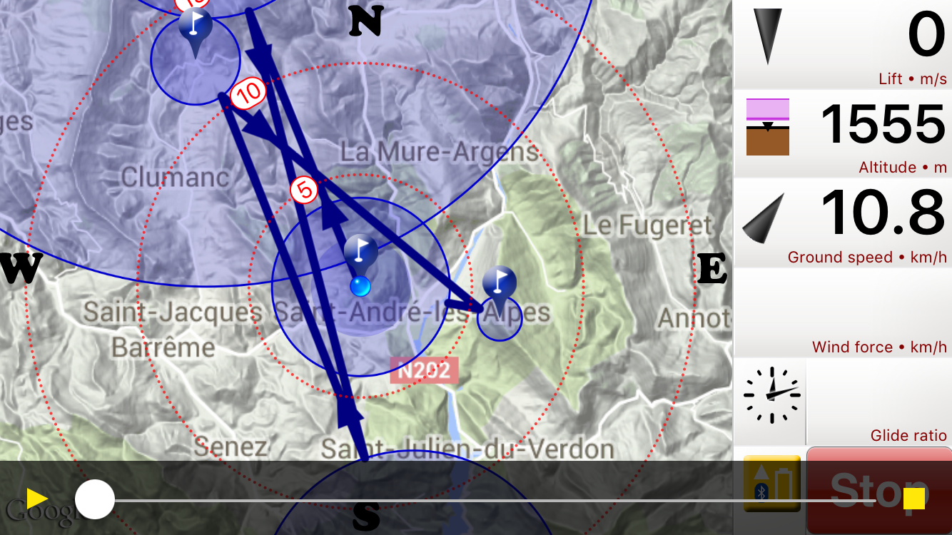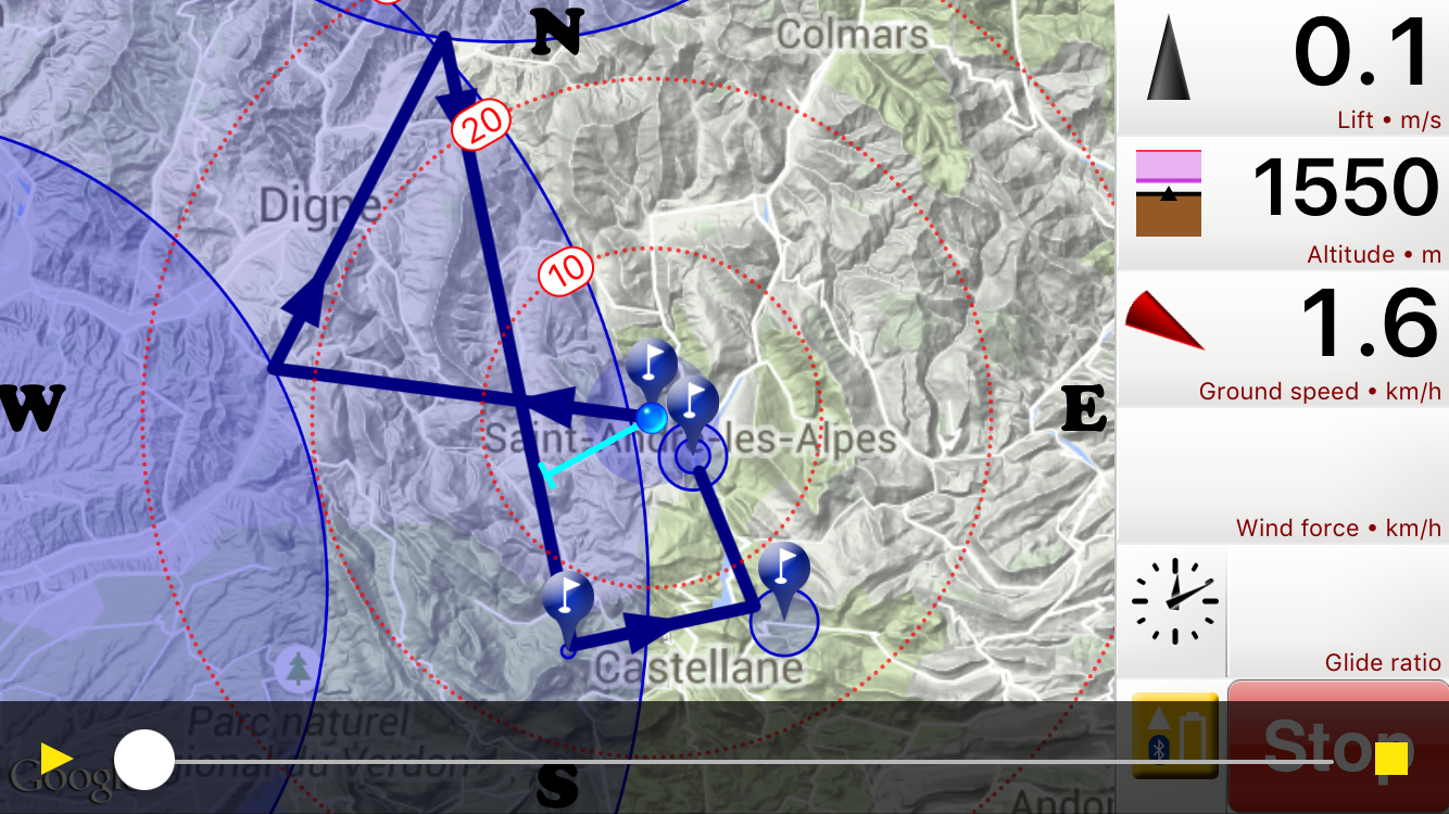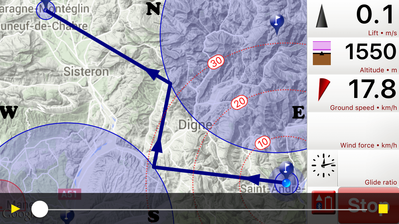 Well, so much for the forecast strongish southerly winds – we ended up flying most of the way in a headwind! Add to that high cloud coming in from the south later in the day and it added up to only nine people in goal! I got most of the way round and I think got to within 7kms of goal after 5.5 hours in the air and absolutely loved it! It was a flight of contrasts – small hills and weak climbs at turnpoint 1, strong climbs and big mountains at turn point 2, buttock-clenching into-wind sink followed by a booming climb on the final leg, then some of the minciest flying I’ve done all year trying to get up from low down near the Sisteron Gliding Club. Oh yes, and power lines too π I ended up gliding towards Sisteron for a beer and easy retrieve, but despite that I didn’t get back to St AndrΓ© until 2130. Great day!!