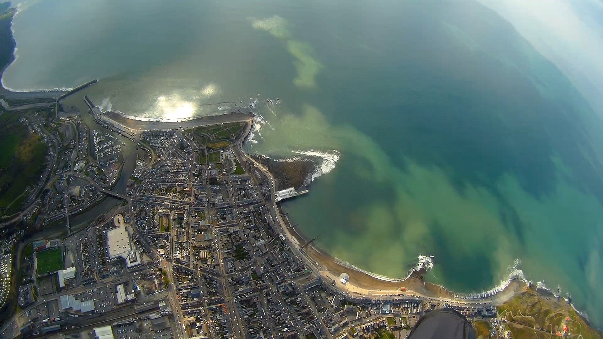 I think I could have glided in from there but I played it safe by topping up under a couple of clouds and with the whole vista of Cardigan Bay opening up to me and glinting in the sunshine, I arrived over Aberystwyth with 3500′ to spare!