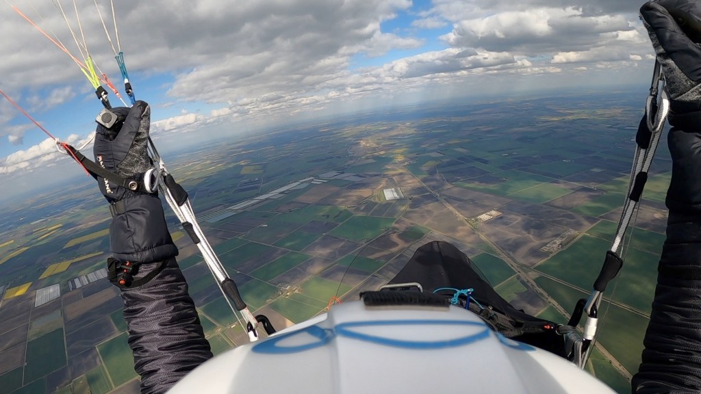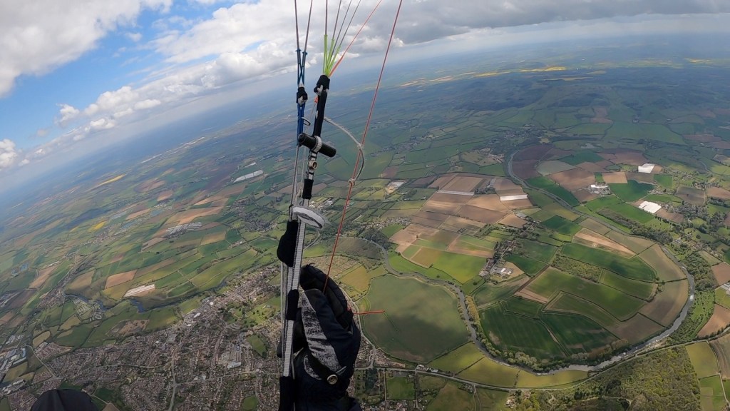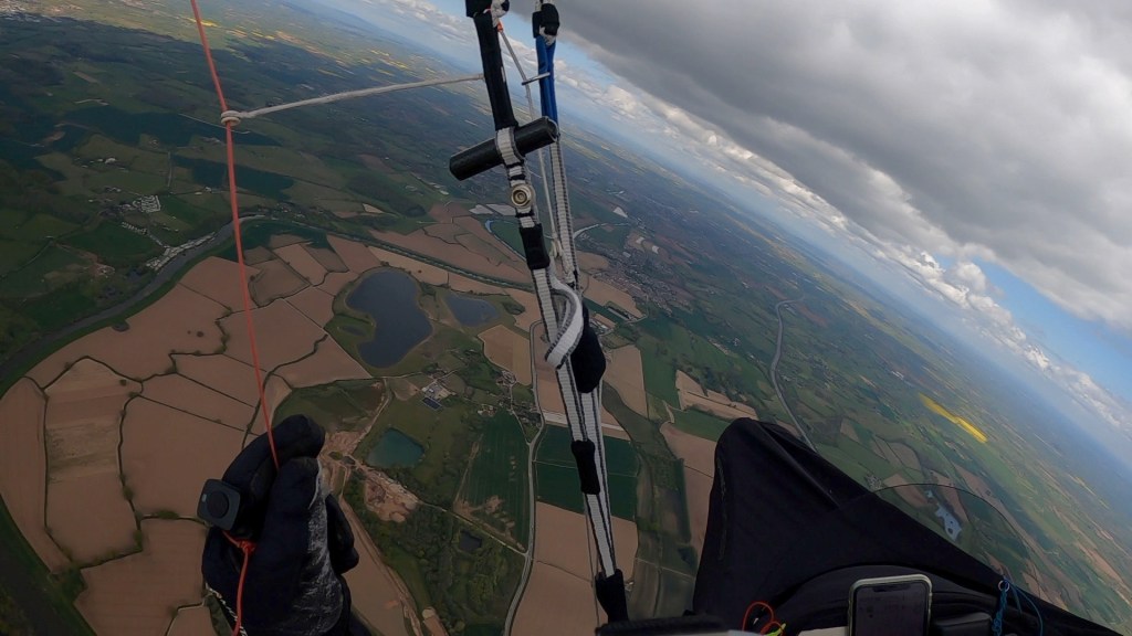 I headed towards the brown fields on the far side of the River Severn and was rewarded with a gentle climb up to 4800’. The other pilots who left the hill a bit lower than me didn’t connect with it and ended up landing a little further on, so I tried (and failed) to catch up with Greg Poole who was a few kms ahead of me at this point.