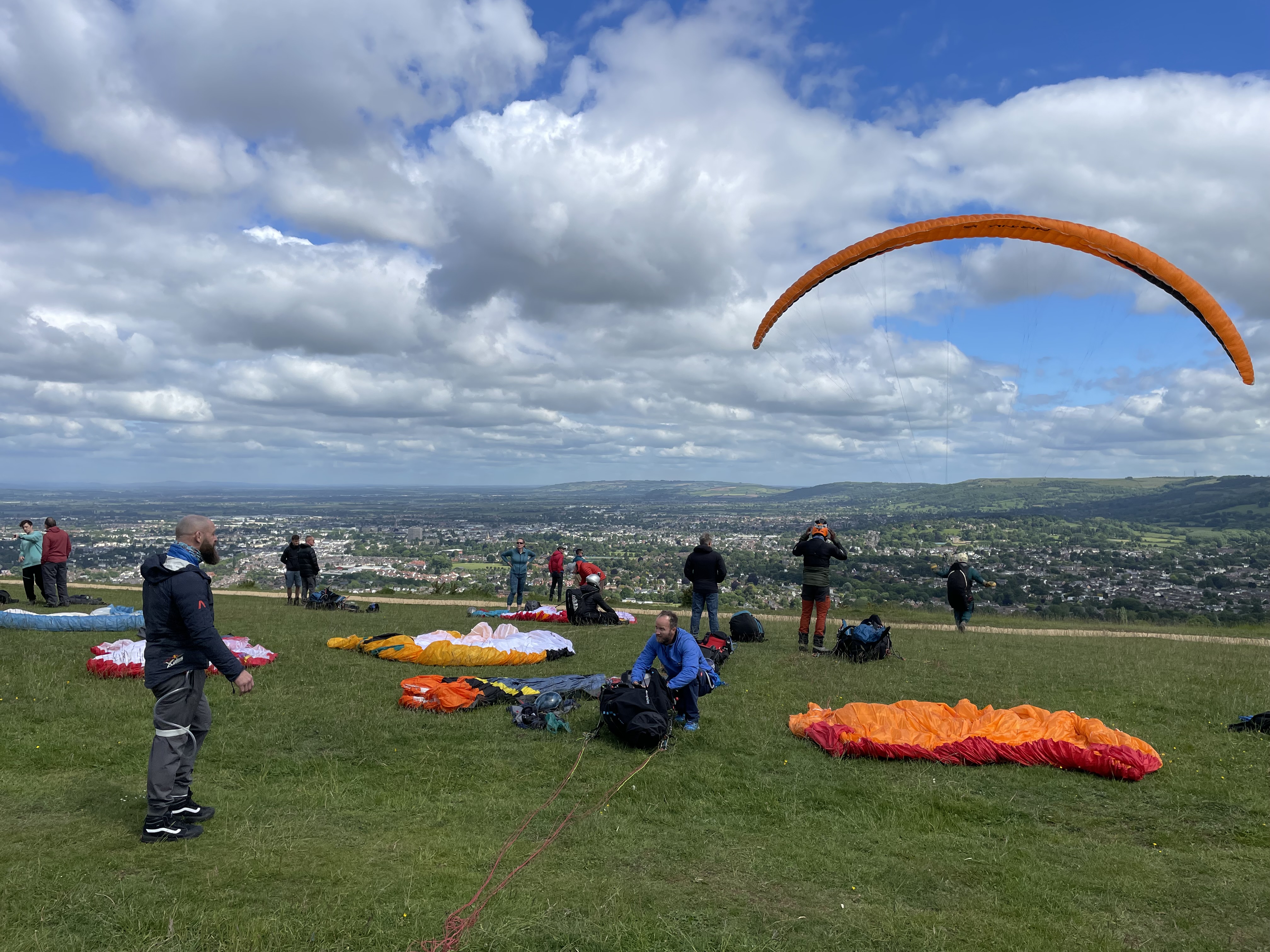Saturday dawned bright and quite breezy but by 1100 the wind had dropped and the hill was getting busy with at least 30-40 hopefuls laying out their kit over most of the take-off area.