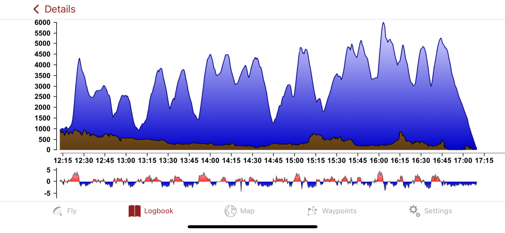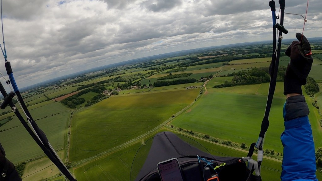 I pinned my hopes on a sheltered sunny “collector” to the south of Stourhead and that did the trick, getting me back up to 3500’ amsl, then a climb a little bit further on over the A303 boosted me right up to 4800’ amsl again – finally things were looking easier!