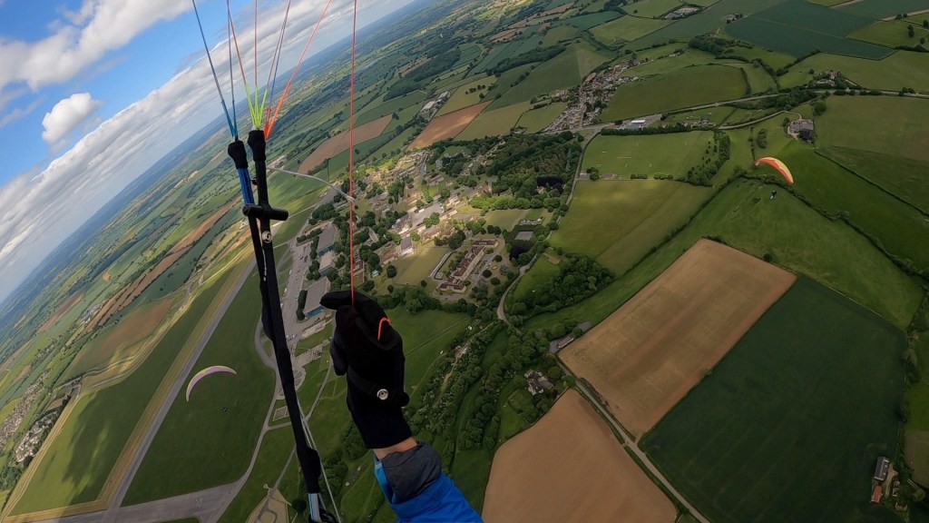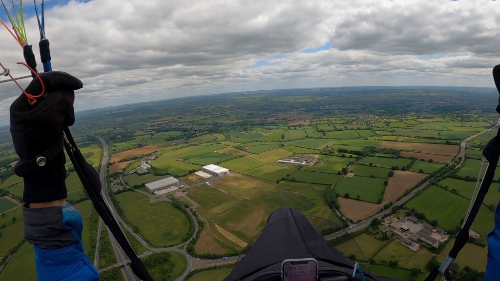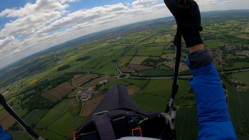 I’d been catching glimpses of Adam beneath me as I thermalled across Dorset, but hadn’t seen him for quite a while, so it was good to see he was still following me as I put in a couple of gentle 360s to establish the wind direction and strength lower down (still a gentle N’ly).