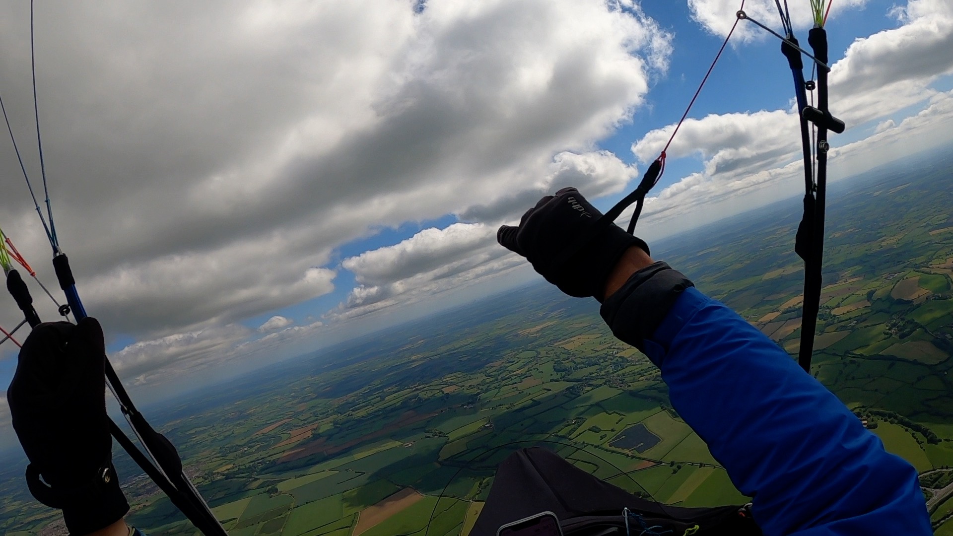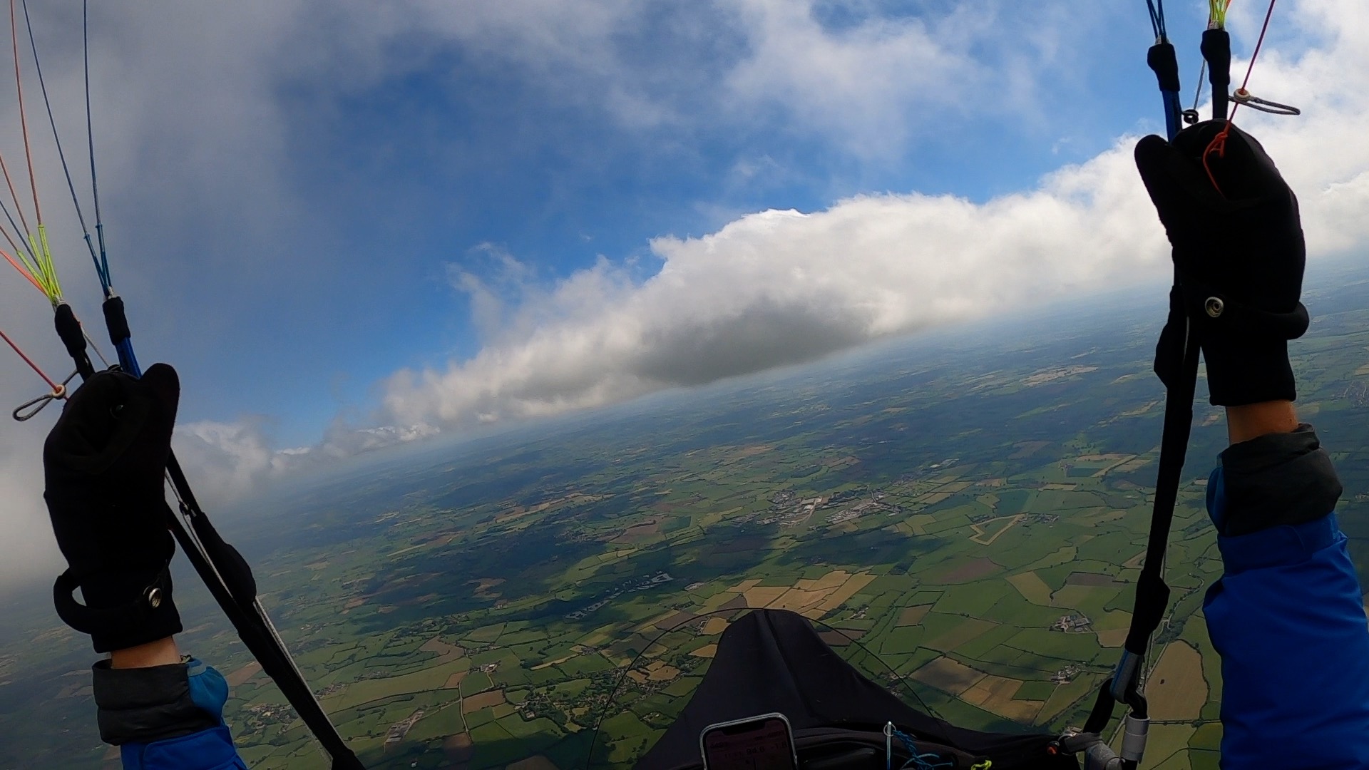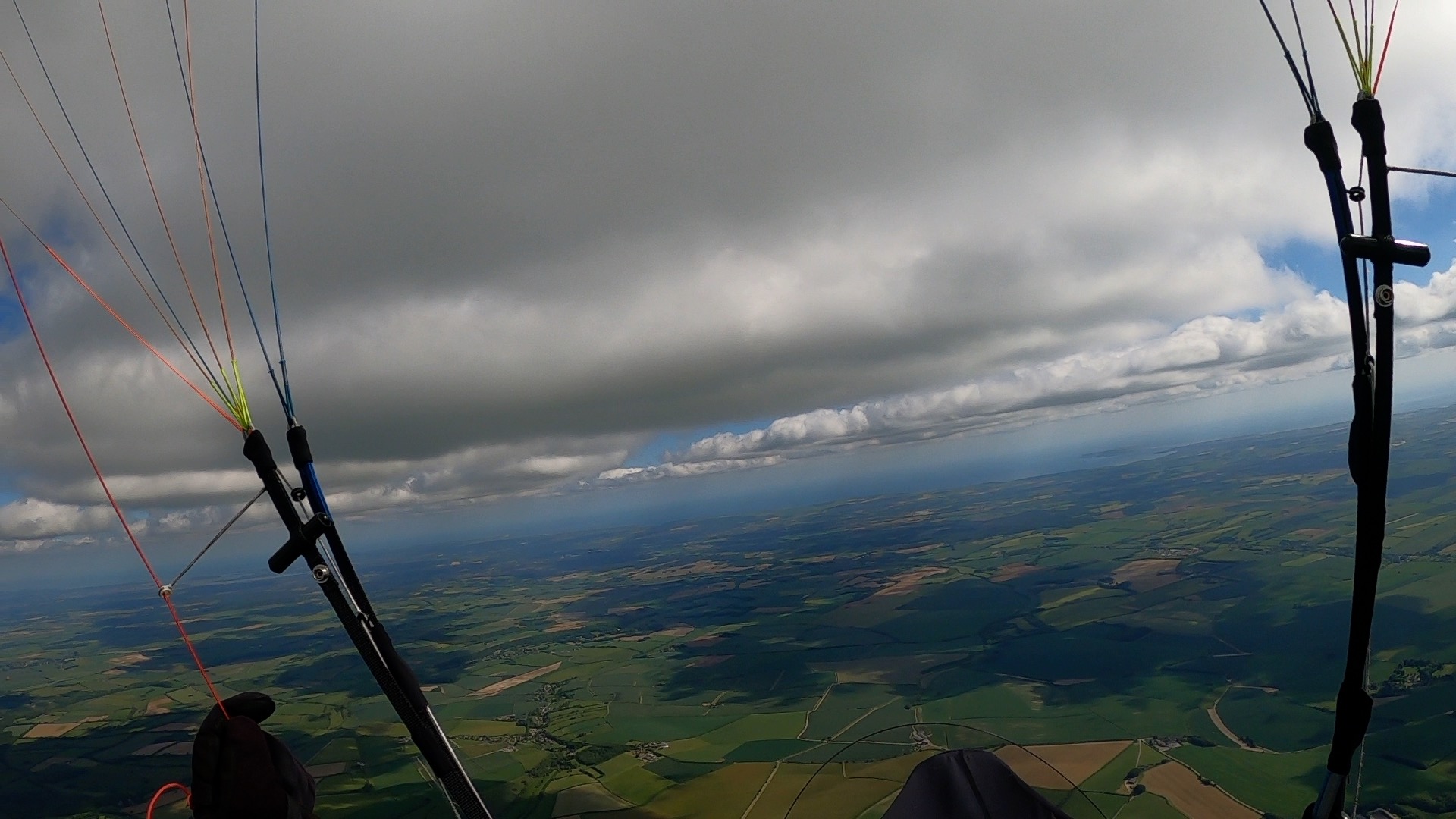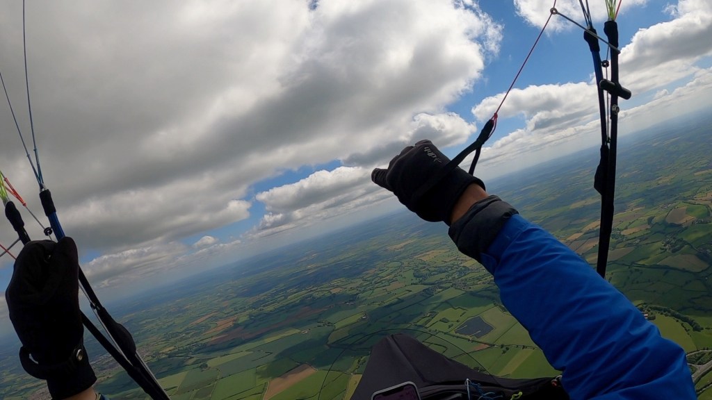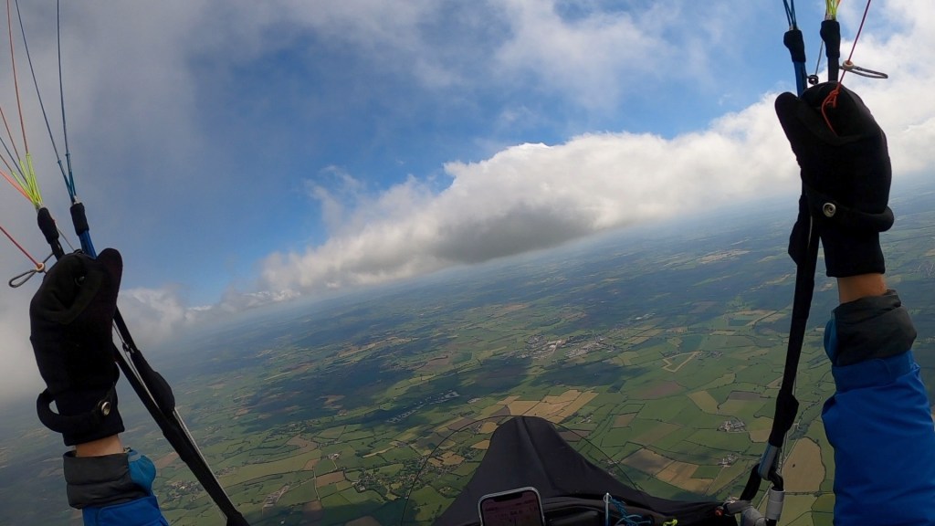 Half an hour later I was back on take-off again and ready for another bite of the cherry. The first seven minutes were pretty tense, flying low over the trees to the left of take-off, just about maintaining height, but then BOOM, five minutes later a dozen of us found ourselves in the wispies at 4300’ amsl after one of the fastest climbouts I’ve ever experienced in the UK.